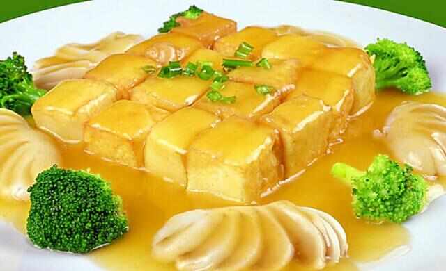 总督豆腐起源于河北保定,与清代重臣李鸿章有关,故而得名。总督豆腐的主料为豆腐和鲜肉馅,加入各种调味料炒制而成。总督豆腐这道菜别看食材都非常简单,可是味道却不简单。这道菜成菜后豆腐外表金灿灿的裹着同样金黄色的酱汁,看着就好吃。夹起一筷,味美鲜香,浓郁的酱汁在口中扩散开来,很是美味!