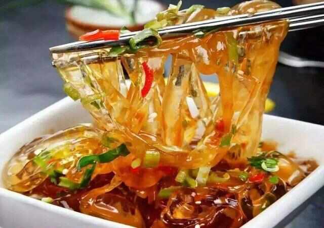 拌海凉粉在大连非常有名,是用大连的特产“牛毛菜”做成的美食。牛毛菜晒干熬煮,经过滤凉凉后切丝,这才成了晶莹剔透白璧无瑕的海凉粉。拌海凉粉的时候可以按照自己的喜好搭配料汁,我最爱的还要属放了辣椒油,麻油,香油,醋的料汁,配上鲜脆清香的黄瓜丝,爽口无比,好吃极了!