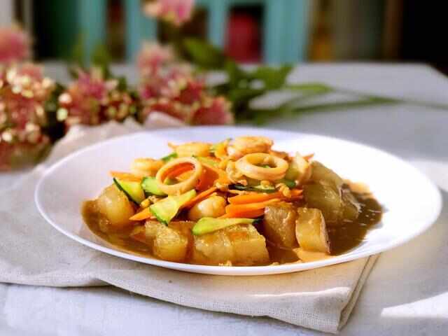 海鲜焖子是大连的一道非常有名的菜肴,Q弹嫩滑的焖子是用地瓜粉制成的白凉粉,切成小块,锅中起油放入蒜泥,酱油等爆香,将焖子与虾仁,海参一起爆炒,就成了这道美味佳肴。一盘海鲜焖子还未端上桌离老远就能闻见蒜香了,离近了你就会发现,焖子的外皮是经油煎过的,口感十足,将焖子与海鲜一起吃,鲜香可口,味道非常不错!