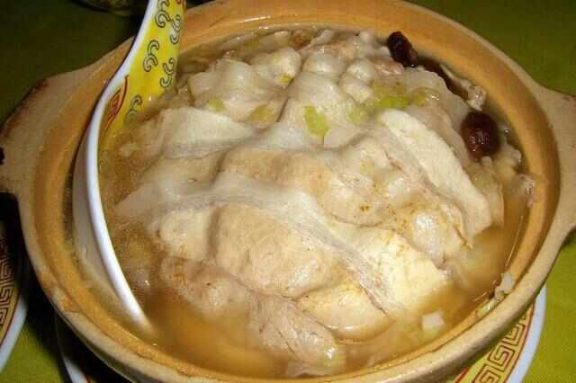 黄焖鱼翅,乃谭家菜的代表菜之一,更是北京地区官府菜的代表,出自清朝末年谭宗浚家中。黄焖鱼翅选用的是“吕宋翅”这种鱼翅有一层肉如同肥膘一样,胶质丰富,非常肥美。这道菜成菜之后颜色非常鲜亮,呈现出金黄的色泽,汤头十分浓郁,鲜香四溢。
