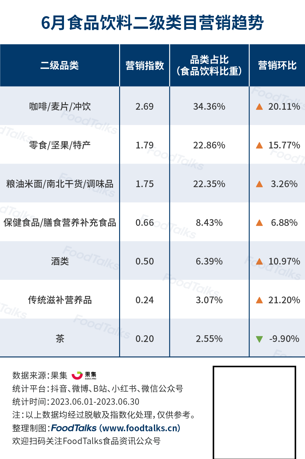 6月咖啡/麦片/冲饮品类的社交媒体互动热度最高,占食品饮料整体的34.36%。另外,除了茶品类营销环比有些许下降外,其他品类营销环比均呈上升趋势,其中传统滋补营养品营销环比上涨21.20%,上升速度相对其他品类较快。