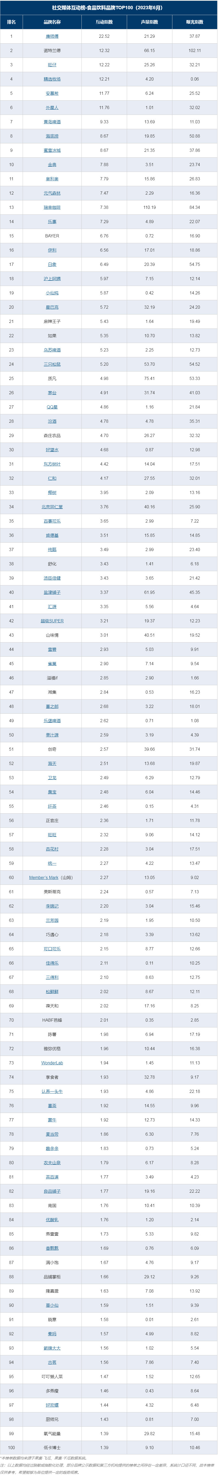以下为“2023年6月食品饮料品牌社交媒体互动榜(TOP100)”完整榜单。