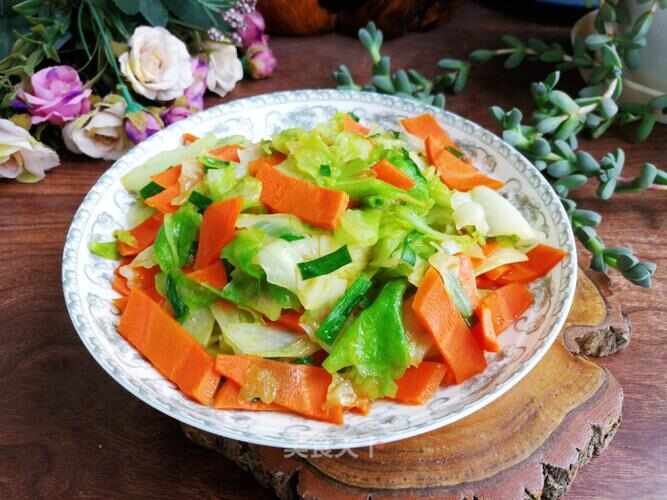 胡萝卜卷心菜是一道色彩鲜艳的素食菜肴,以胡萝卜和卷心菜为主料,搭配适量的调味料炒制而成。它的口感脆嫩,味道清爽,富含维生素和纤维。