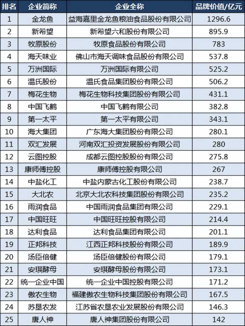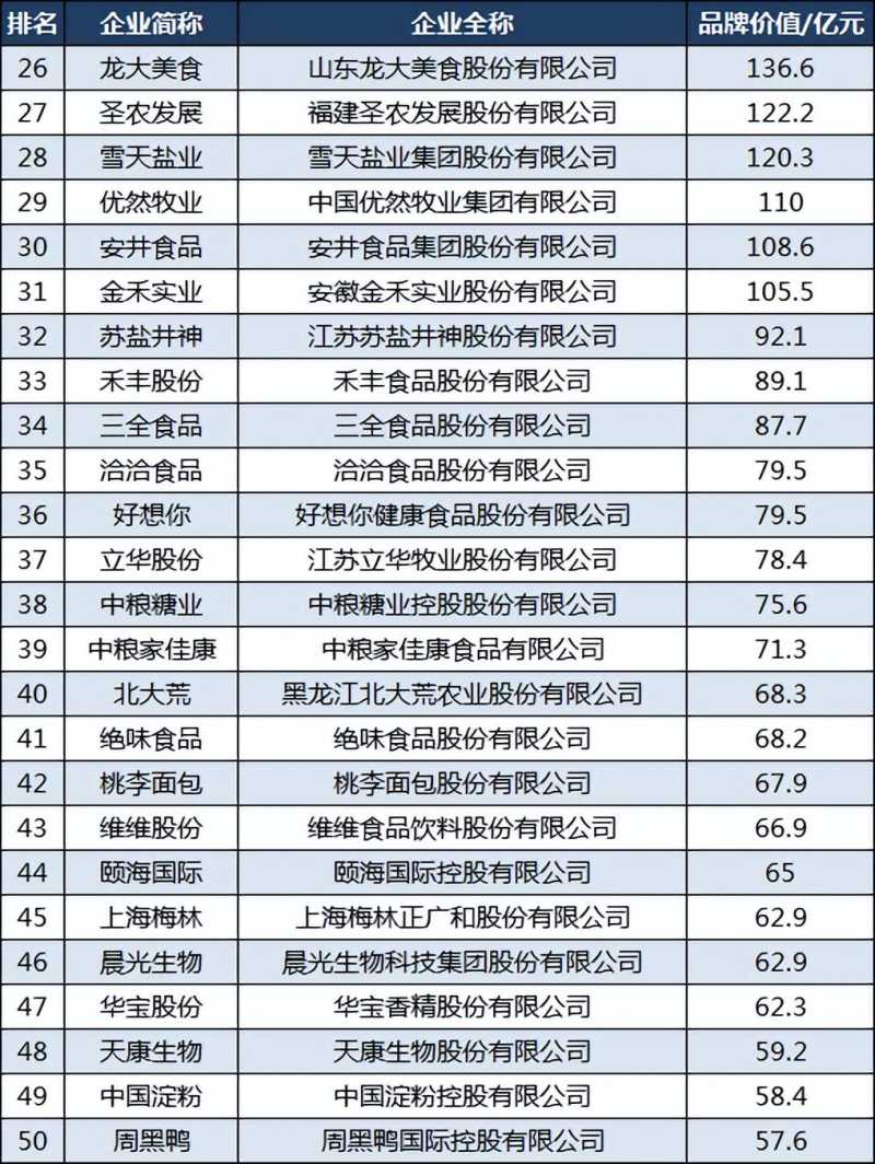 雨润食品排名第16位,汤臣倍健排名第20位,苏垦农牧排名第24位,龙大美食排名第26位,悠然牧业排名第29位,三全食品排名第34位,好想你排名第36位,桃李面包排名第42位。