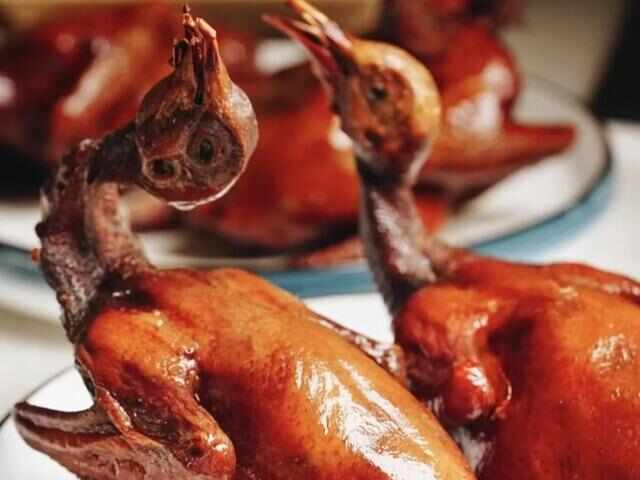 红烧乳鸽在广东中山最为闻名,这里就没有一只鸽子能够活着离开中山,广东吃鸽子有红烧、盐焗、炖汤、焖饭,红烧最为经典。乳鸽外脆里嫩,外皮通红有光泽,口感香脆。一切两半扒开香脆的皮,里面肉质特别鲜嫩,撕开时还有肉汁渗出,咬进嘴里还会爆汁。紧实的鸽肉有着秘制的卤香味,还带着淡淡的茴香香气,经典红烧乳鸽绝不会名不虚传。
