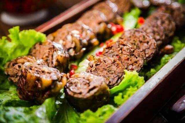 内蒙古人喜欢吃羊是出了名的,不仅喜欢吃羊肉,还喜欢吃羊的内脏。这道网油包羊肝就深受内蒙古人的喜爱。网油指的是羊油,一头羊里只含极少的羊油,因此这是一道可遇不可求的菜品。其做法并不复杂,一般是用羊油裹住羊肝,将其放在炭火上烤30分钟左右即可。烤好的 羊肝因为油了羊油的包裹,不会烤干、烤黑。羊油受热融化后,渗入到羊肝内部,使羊肝吃起来不会太噎。蒙古人喜欢一口一块的吃这道网油包羊肝,让香味全都遍布口腔里。但很多外地人都受不了羊肝的那股膻味,认为难以下咽。