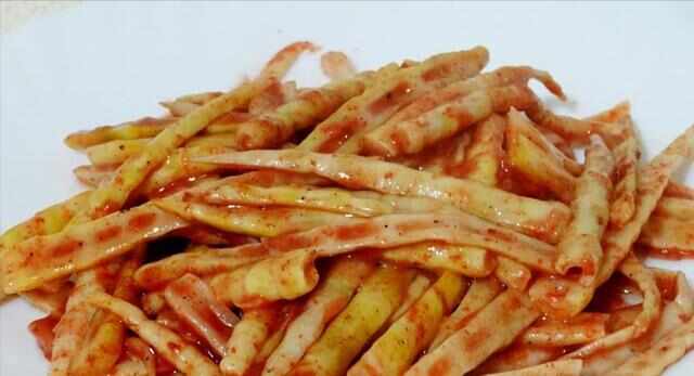 干炸响铃是一道杭州特色小吃,以猪大肠为原料,切成片状,经油炸制而成。成品质感脆而焦香,色泽金黄,出锅之时的清脆油炸声就犹如响铃般悦耳,故而得此“干炸响铃”之名。