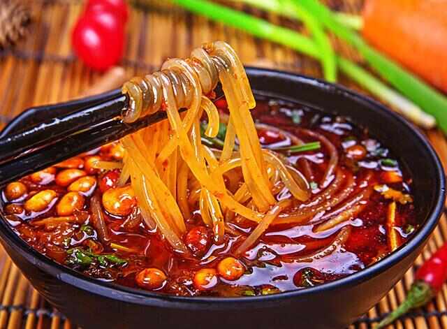 重庆酸辣粉是一道典型的川味小吃,以酸辣味为主打。粉条Q弹有嚼劲,搭配酸豆角、酸萝卜、肉末等调料,酸辣开胃,让人回味无穷。