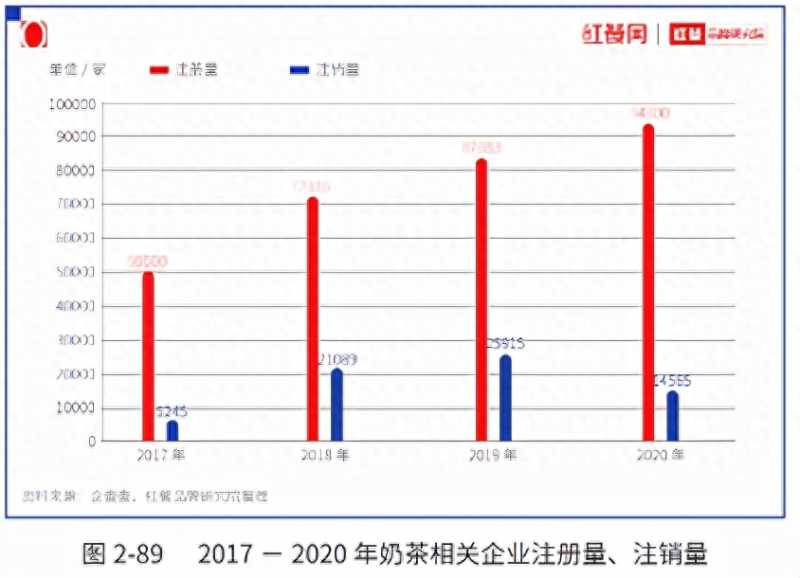 企查查数据显示,2020 年我国在业奶茶相关企业多达 30.63 万家,且近四年注册量上升趋势明显。2017 年奶茶相关企业注册量 5 万家,2019 年增至 8.77 万家,2020 年新增注册量达到 9.43 万家。