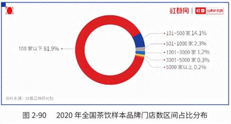另一方面,根据《中国餐饮品类和品牌发展报告2021》数据,2020年茶饮品牌门店总数在100家以下的占到81.9%。可见在现制茶饮行业中,大部分茶饮品牌门店数量偏少,整体规模也普遍偏小,竞争力尚不强,也给了很多新进入的茶饮品牌以机会。