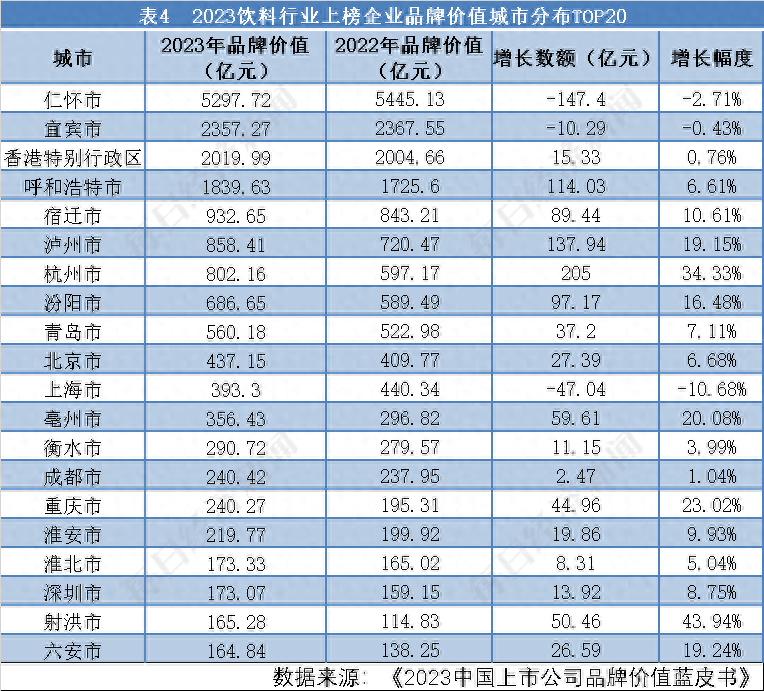 “2023中国饮料行业上市公司品牌价值榜”的上榜企业共来自35个城市,按照品牌价值和企业数量的城市分布选取前20位,可得表4和表5。