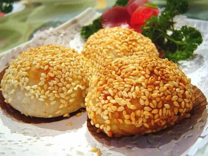 糕点是常州人民钟爱的一道小吃。 糕点表面色泽金黄,富有油润感,还点缀着白芝麻。 糕点口感软糯弹牙,油香四溢。里面包裹着豆沙馅,豆沙的味道混合着芝麻的香气,真是香极了。