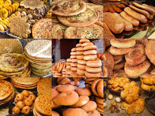 在新疆,馕的种类有很多,油馕,肉馕,芝麻馕,窝窝馕等等。其中最大的馕叫“艾曼克”,中间薄,直径可达40-50厘米,被称为馕中之王。最小的做工最精细的馕叫“托喀西”。每种馕都金黄焦脆,芳香四溢。