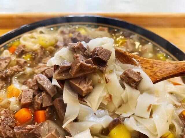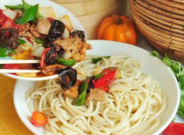 拉条子又叫新疆拌面,在全国各地也广受欢迎。叫它拉条子是因为人们在制作的时候不用压不用擀,单靠拉而成。一盘拉条子足以满足你所有的需求,各色各样的蔬菜: 青椒、茄子、白菜、豆角、蘑菇、蒜苔、芹菜等等,再配上新疆风味的牛羊肉,看起来就像一盘全家福,应有尽有,光鲜亮丽,层次分明,入口汁浓味香,滑嫩鲜美。