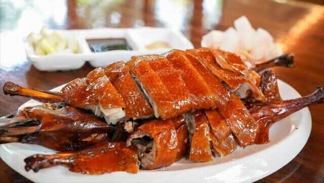 宜良烤鸭是昆明市宜良县的传统佳肴,距今已有600多年的历史了,据悉是将北京烤鸭进行本地化改进后的经典美食。北京烤鸭落地宜良的背后还有一段历史小故事,相传在光绪27年时,宜良西村人刘文跟随一位秀才进京赶考,当秀才在考场考试时,刘文闲来无事便去烤鸭店转悠,顺道学习了制作烤鸭的技法,之后刘文将制作北京烤鸭的手艺带回了宜良,并且还依据本地人的口味做了改良,烤制成熟的宜良烤鸭皮薄肉嫩、肥瘦相间、色泽油润,深受食客们的喜爱。