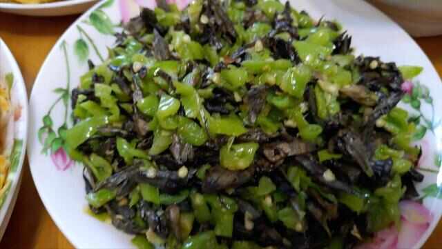 青椒炒干巴菌是云南特色美食,这道菜以青椒和干巴菌为主要原料。众所周知云南盛产各种菌子,而干巴菌又是菌中上品,闻起来有一股非常浓烈的松叶芳香,嚼起来更是异常鲜美。将青椒与干巴菌放在一起炒,那味道简直绝了,老外尝了一口便停不下筷子,恨不得连舌头都一块吞下去。虽说这青椒炒干巴菌看起来黑黢黢的,卖相并不咋滴,但是闻起来香气扑鼻,尝起来鲜辣味美。
