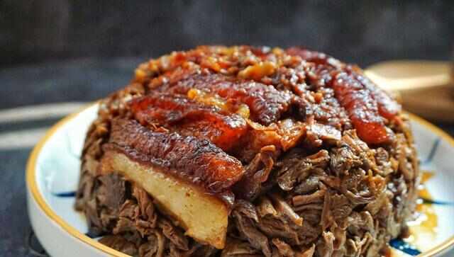 梅菜扣肉是福建地区的一道传统家常菜,当地人非常喜欢在过年过节的时候烹饪享用。梅菜扣肉以永定地区的梅菜干和猪肉作为主要食材,通过泡发、蒸制的步骤制作而成。成菜后的梅菜扣肉外观是深褐色的,非常挑战人的味蕾。吃到嘴里也是软烂的,真的是一道肥而不腻的好菜。