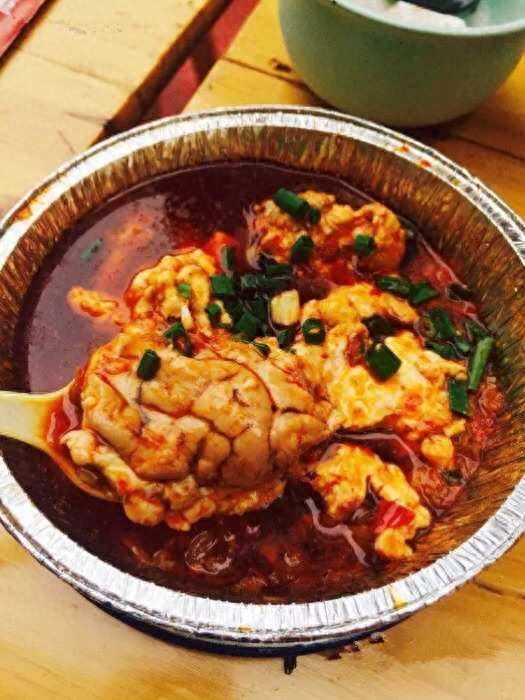 烤脑花是一种用猪脑或者牛脑做成的烤制菜肴,是重庆人敢吃敢玩的一种美食。它的做法是将猪脑或者牛脑洗净后切成小块,用盐、料酒、生抽、老抽、辣椒面、花椒面等调料腌制一段时间后放入烤箱烤至两面金黄,然后将脑花放入一个大盘中,撒上芝麻、香菜等装饰,最后浇上热油和红油。重庆烤脑花的特点是脑花香嫩不腥,外焦里嫩,调料香辣刺激,可以挑战味觉和胆量。