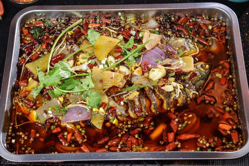 万州烤鱼是一种用草鱼或者其他淡水鱼做成的烤制菜肴,是重庆万州区的特色美食。它的做法是将鱼去鳞去内脏洗净后切开,在两面划上刀口,并在刀口中塞入姜片和葱段,然后在鱼身上涂抹上盐、料酒、生抽、老抽、辣椒面、花椒面等调料,腌制一段时间后放入烤箱烤至两面金黄,然后将鱼放入一个大盘中,撒上花生碎、香菜等装饰,最后浇上热油和红油。重庆万州烤鱼的特点是鱼肉香嫩不腥,皮脆肉嫩,调料香辣适口,可以满足各种口味的需求。