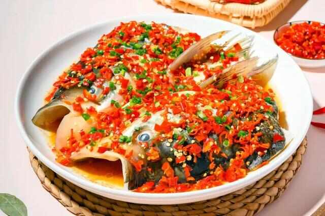 剁椒鱼头是湘菜中的一道经典,湖南本地的鱼选用的是新鲜的花鲢鱼,鱼头大,营养丰富,用来做剁椒鱼头再合适不过了,这道菜是去了湖南必吃的菜肴之一。湖南人爱吃辣椒,家中常备自制剁椒,很多菜都用得到剁椒。洗干净的鱼头切成两半,加入适量的调料腌制,而后放在铺好葱姜丝的大盘子中,放入蒸锅里蒸10分钟左右,再将剁椒、豆豉等在热油中煎炸,一起浇在蒸好的鱼头上。