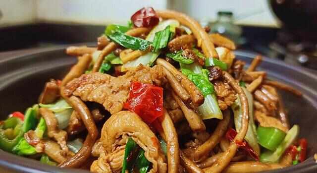 茶树菇营养价值非常高,是比较罕见的菌类。常常搭配五花肉和辣椒等,鲜香咸辣,非常下饭。用水焯好的茶树菇切成段,五花肉要切成薄片。先大火将葱姜煸炒,再加入五花肉爆炒,放入小米辣和辣椒酱等翻炒,再把焯水的茶树菇和调味料放入煸炒。干锅底部铺一层新鲜的洋葱丝,再将炒好的菜放进锅里。茶树菇富有嚼劲,越嚼越香,五花肉香气浓郁,鲜辣干香,回味无穷,实在是过瘾。