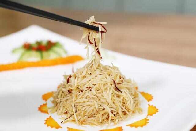 发丝牛百叶因形状如发丝一般而得名,口感鲜嫩脆爽,颜色白净如雪。配料丰富,有红椒、冬笋,加入地方产的酱油和白醋烹饪入味,大火爆炒而成。历史上多位作家、名人曾专门点过这道菜,红白相间如傲梅白雪,口感脆爽,富有嚼劲,堪称湘菜中的一绝。