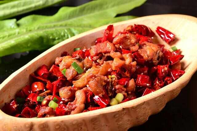 湖南因地理位置,气候潮湿,因而人们喜欢将辣椒、生姜等作为家常食材,口味重,而麻辣子鸡深受百姓的喜爱。这道菜历史悠久,可以追溯到清朝,主要的食材有新鲜鸡腿、辣椒和若干调味料。鸡腿要先去骨切块,和鸡蛋、淀粉、调味料等一同腌制后,在油锅里炸至金黄。将辣椒、生姜、葱蒜等放入锅里煸炒,加入炸好的鸡块迅速翻炒,讲究火力,口感鲜辣、鸡肉酥嫩可口,营养丰富,味道美妙,成为湘菜中的精品。