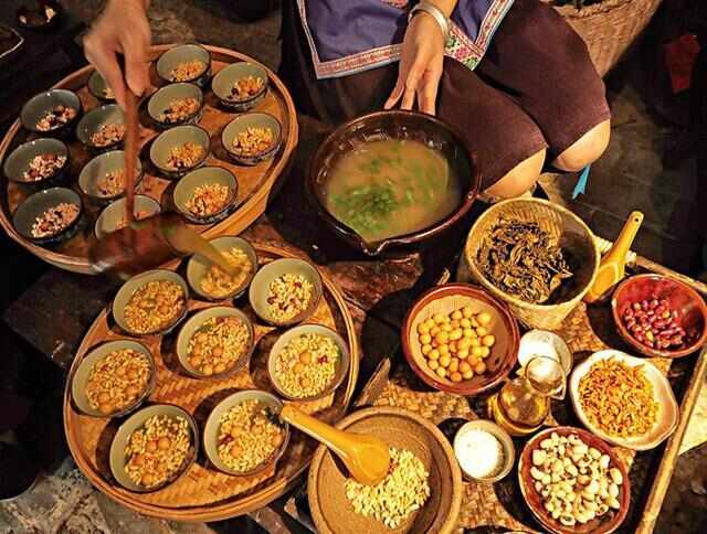 打油茶亦称“吃豆茶”。侗族传统待客食品。流行于湖南、贵州、广西等地。用油炸糯米花、炒花生或浸泡的黄豆、玉米、炒米和新茶配制成。有的还加葱花、菠菜、猎肝、粉肠。侗族在不同的场合吃不同的豆茶。