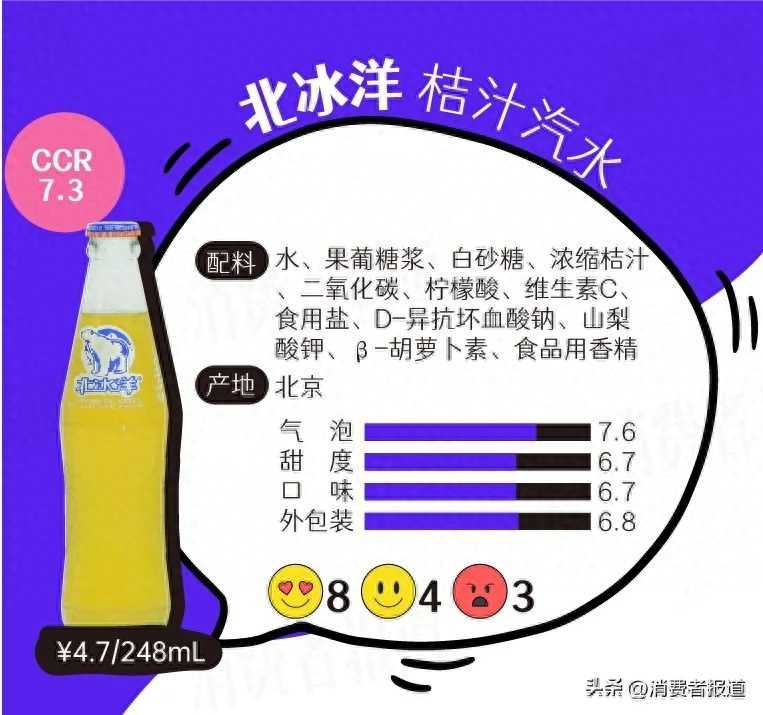 北极贝贝:北冰洋的气泡非常足,桔味浓郁,怀旧的味道,并非甜味占主导,酸甜适口。