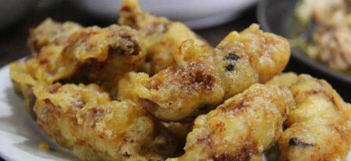 石塘炸蚝干用面粉包裹,内馅是蚝干、香菇、荸荠、冬笋和肉丝。入锅炸至外皮金黄,口感异常清爽香甜,内有六种食材,各有不同的调料,厚、香、甜、脆、清。