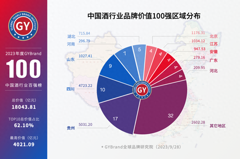 9月28日,GYBrand独家编制的2023年度中国酒行业品牌价值100强研究报告正式发布。该榜单于2020年首次发布,引起了业界的广泛关注和认可,受疫情的影响,时隔三年再次发布中国酒业百强榜。本年度中国酒类品牌价值100强的品牌价值合计18043.81亿元,覆盖白酒、啤酒、黄酒、保健酒、预调酒、果酒等领域。