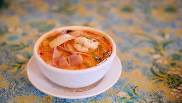 泰国国汤—冬阴功汤。“冬阴”在泰语里面是酸辣的意思,而“功”指的是虾,整体翻译过来就是酸辣虾汤,这道美食只有在泰国才是最正宗的味道。因为冬阴功汤里加入了泰国特有柠檬、泰式鱼露以及朝天椒,出了泰国就找不到如此正宗的原料了。所以我们在一些泰式料理店里喝到的冬阴功汤,总是差了那么点味道。