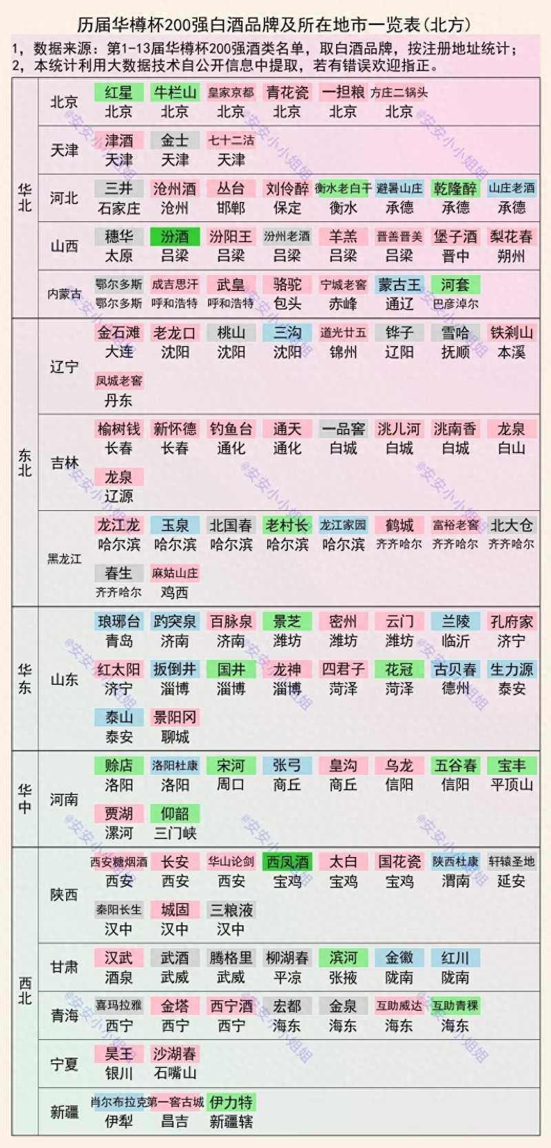 在13届华樽杯白酒品牌中,共有118个分布在北方,其中山西省吕梁市的汾酒和陕西省宝鸡市的西凤酒知名度最高。