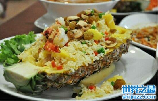 泰式菠萝炒饭,一听名字就肯定是用菠萝加上米饭合作而成的。但菠萝是用的菠萝的皮,像是一个壳,将炒饭放入菠萝的皮里面,菠萝的味道完全融入到米饭中,色香味十足,是个不错的佳肴。