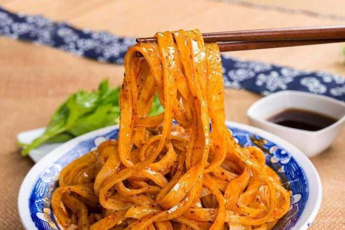 陕西饸饹是陕西的传统小吃之一,由荞麦面或小麦面制成。这道美食的特点是色泽黄亮,口感爽滑,配以羊肉、香料和辣椒等材料,味道独特。陕西饸饹适合夏季食用,是解暑佳品。
