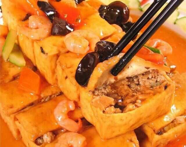 博山豆腐箱的主要原料是豆腐,把虾仁、虾滑和青菜混合起来做成馅,塞到掏空了的大块豆腐中,豆腐味道很醇香,口感细腻,就连汤汁也很稠,味道非常奇特。