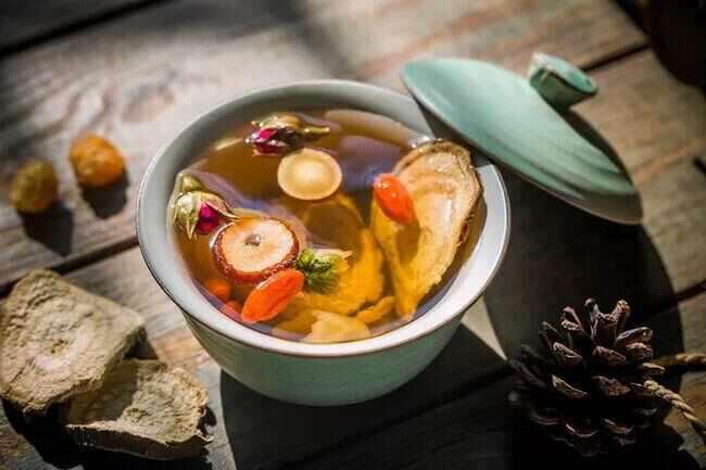 准备好食量的黄精、黑枸杞、桑葚、杜仲雄花、葛根、人参、甘草等药材,加入纯净水炖煮半小时左右,炖煮好的人生固本茶具有补养身体、补血益气、滋养肾脏的功效。