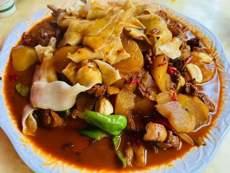 新疆大盘鸡是新疆地区的特色美食,以其辣味浓、肉质鲜美而著称。新疆大盘鸡的鸡肉口感鲜嫩,搭配上辣味十足的调料和面条,味道十分独特。