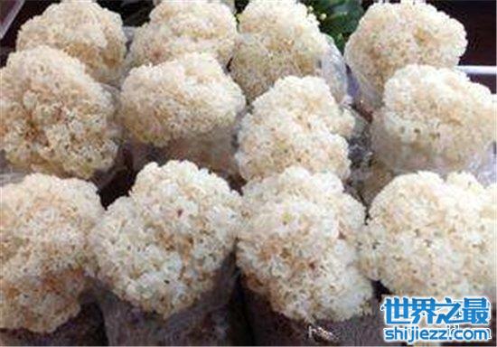 绣球菌,每公斤大概卖800至1000元左右,因为它长得像绣球一样,所以叫它绣球菌。他主要生产在南部地区和西部地区,对女人的美容有非常大的功效,女人可以多吃它来达到美容的效果。