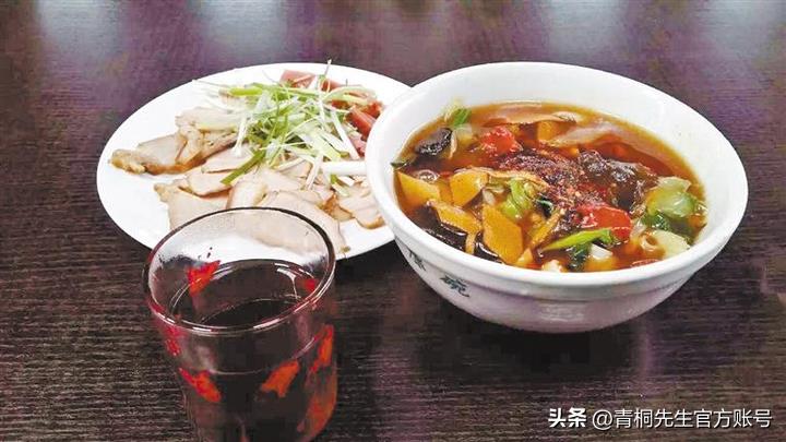 平凉羊肉泡馍,与陕西兄弟略有不同,平凉羊肉泡先以牛羊肉混合熬汤,加黄花、木耳、干豆腐、粉条等配菜,再加四两羊肉片,汤汁清香不腻,再配上死面饼子和糖蒜,还有香辣酱,那叫一个地道。