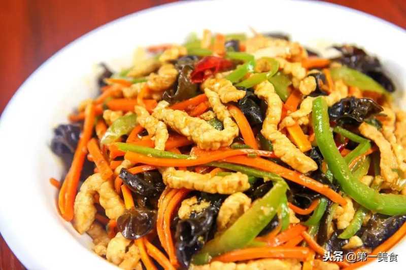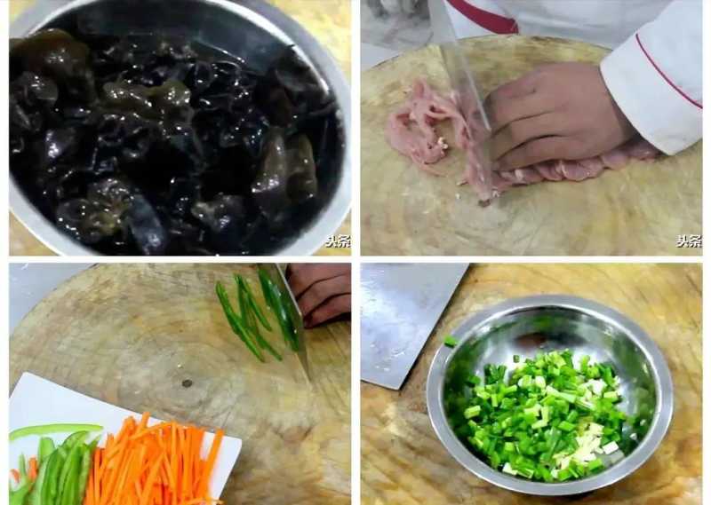 准备木耳一把,加一勺盐泡一个小时。瘦肉一块切丝,然后泡在清水中保鲜。把胡萝卜青椒清洗干净,切成细丝。大蒜拍扁切成碎沫,小葱切成葱花,再加入一把红干椒。