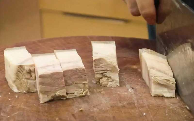 放入葱姜料酒去腥,开锅以后打去浮沫。然后盖上锅盖,继续煮10分钟左右。把煮好的五花肉取出来,切成一口一个的大块。