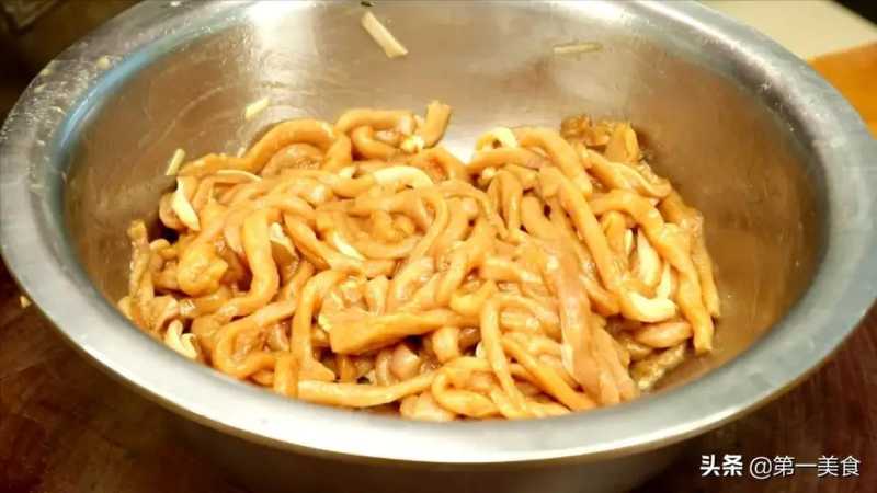 肉丝控干水分,放入适量食盐,老抽,用手抓匀。打入一个蛋清,使劲抓匀上劲,打出胶,肉质才够鲜嫩。加入淀粉,抓匀加摔打,盆里肉黏而硬。