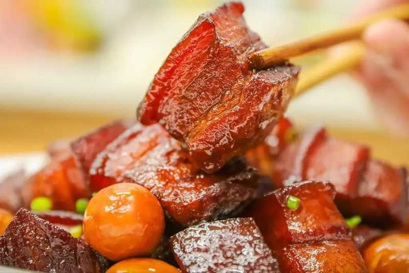 10分钟以后,把炖至上色的五花肉倒在电压力锅里面压20分钟。时间到后倒入炒锅收汁,放入鹌鹑蛋。