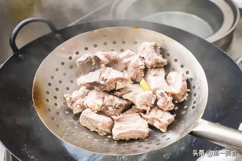锅内加入适量的清水,把排骨倒入锅中,加入料酒10克,几片生姜去腥,推动排骨充分煮出里面的血水和多余的脂肪,水烧开后打去锅中的浮沫,把排骨捞出控水备用。