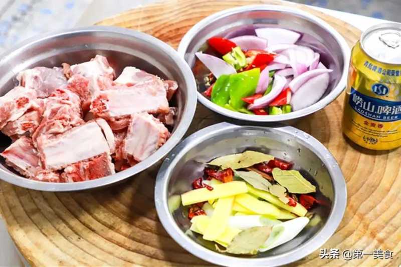 我们把排骨剔开、剁成小块;生姜切成片,放入盆中加入八角一粒、几个干辣椒、几片香叶,一节桂皮备用;青红椒滚刀切成块用来搭配颜色;洋葱半个切成片,把粘在一起的打散;再准备一罐啤酒备用。