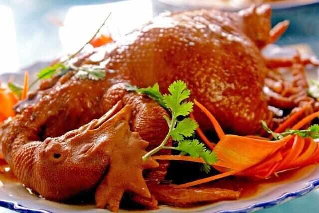 布袋鸡是济南夏津县的地方传统名吃,又叫“海味什锦鸡”,因为成品看起来很像布袋,所以取名布袋鸡。布袋鸡是选用散养的土鸡作为原料,宰杀去毛后从咽下切个小口,剔除骨头和内脏,然后把海参、鲍鱼、火腿等名贵食材装入其中,先用油炸至金黄,再上蒸笼蒸制而成。布袋鸡的特色:肉鲜馅大、肥而不腻、香嫩可口。