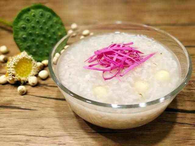 荷花粥是一道常见的中医药膳,是济南著名的小吃。用大米煮粥,待熟时,将荷叶洗净盖在粥上,用文火焖少许荷叶变淡绿。含有皮素和樨草素等成分,具有清香化痰,清暑宁神作用,是镇心益气、驻颜轻身的美容药食佳品。花卉不仅具有沁人心脾的芳香与赏心悦目的色彩,使人得到美的享受。有些花,花蕾和 花粉食用之后还能调节人的神经系统,促进血液循环,改善心肌功能,提高肌体免疫能力,起到治病,健身,美容和延年益寿等效果。花卉入馔,能烹制出色彩绚丽,清香四溢,风味独特的菜肴。花卉入粥,自古以来就是养生保健,美容肌肤的上品。现介绍几款以飨诸君。