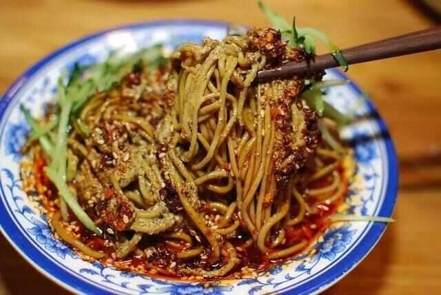 油泼辣子面是陕西关中地区的汉族传统风味面食,制作时用关中麦子磨成的面粉,手工拉成长宽厚的面条,用酱油、醋、味精、花椒等佐料调入面汤,捞入面条,淋上烧热的植物油即成。
