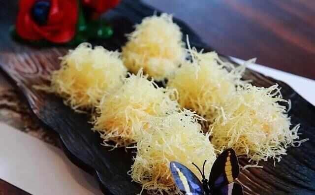 燕奶金丝球是佛山一道创新的顺德菜,其做法是把打好的虾胶包裹燕窝和牛奶成丸,再拍上脆皮丝,慢油浸炸至熟即可。外形像个金黄色的金球,口感甘香嫩滑、外脆内滑。值得惊喜的是,咬开时还有燕窝奶汁溢出,真是一道独具风味的创新品种。